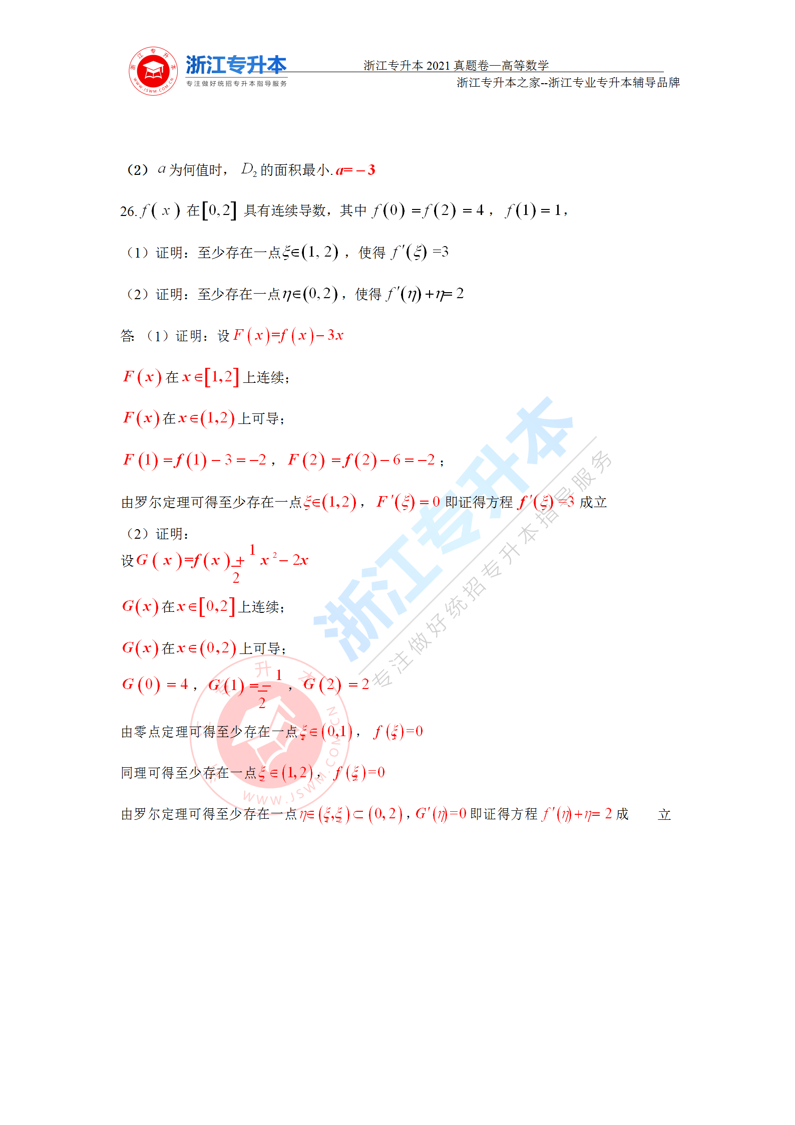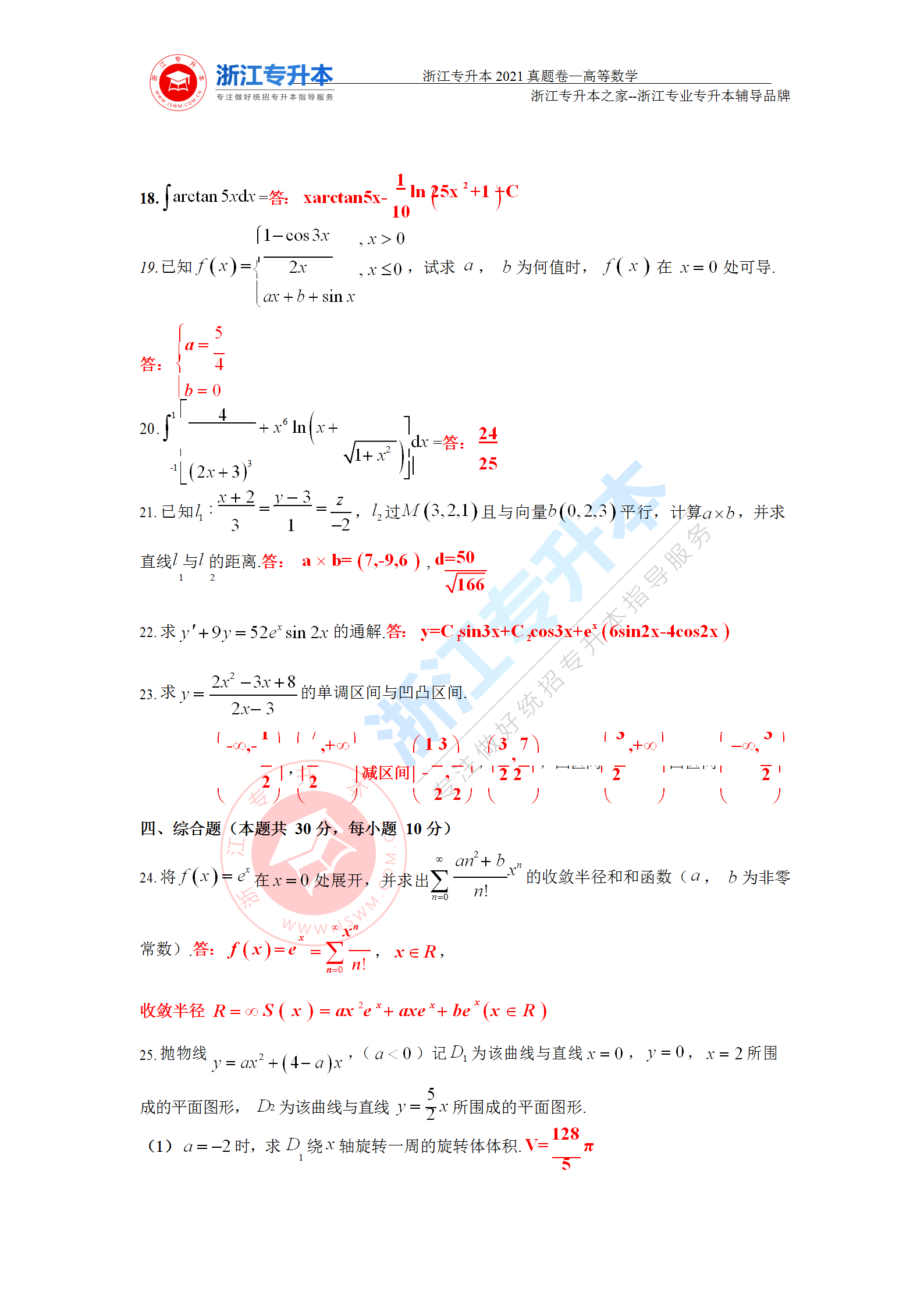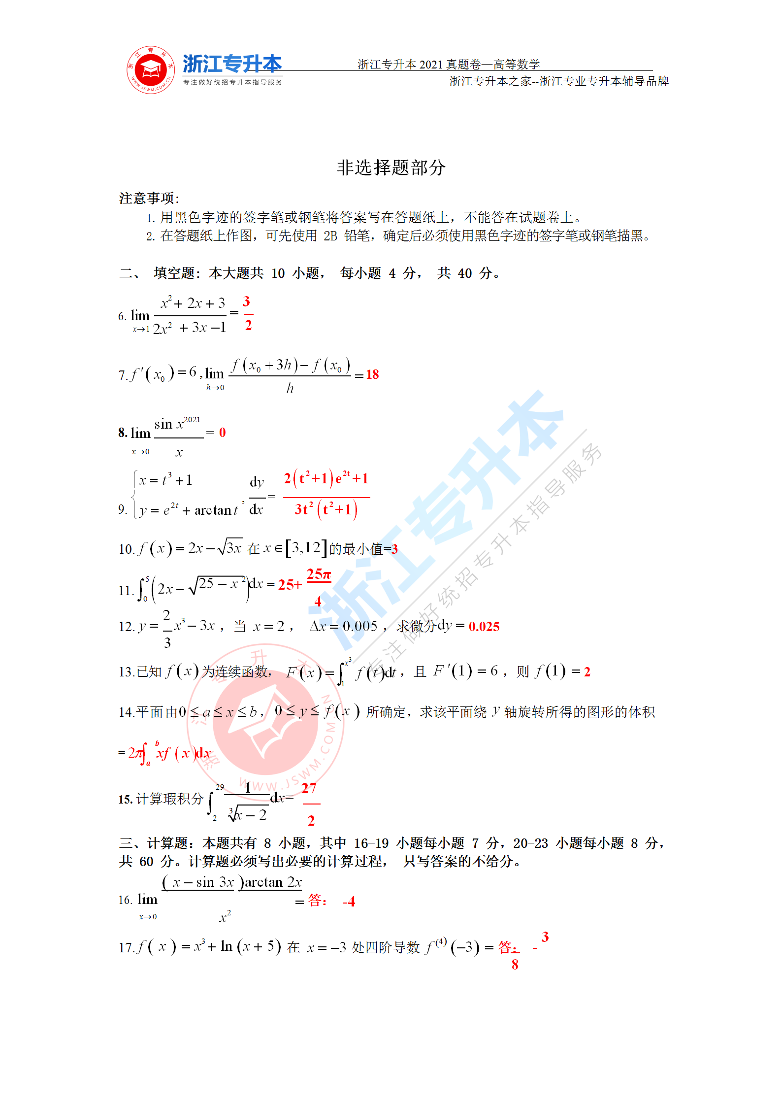 2021年浙江專升本高等數學真題答案