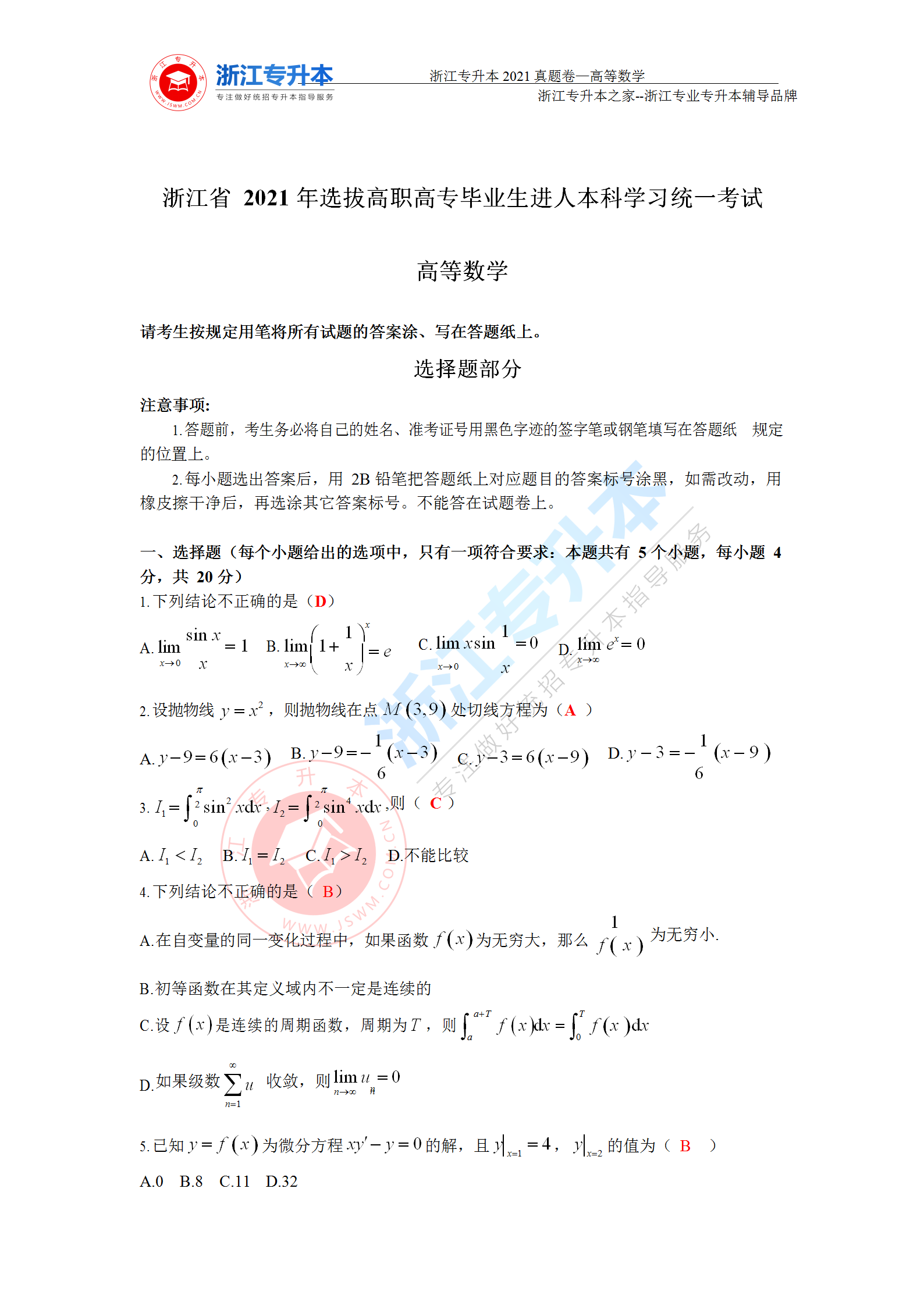 點擊下載:2021年浙江專升本《高等數學》答案