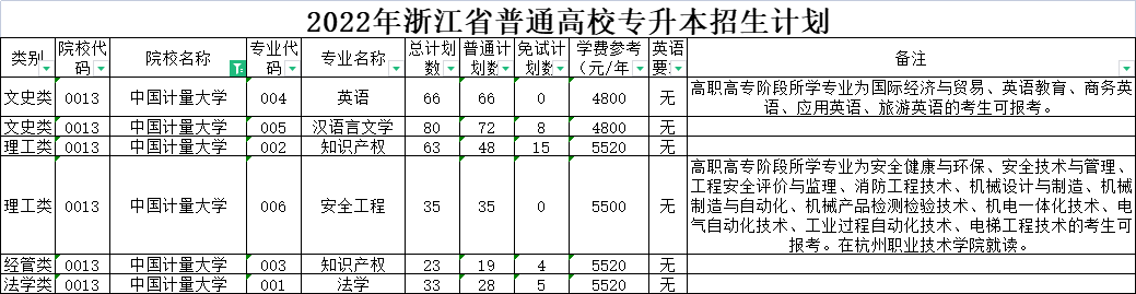 | 法學類 | 0006 | 杭州電子科技大學 | 011 | 法學 | 100 | 90 | 10 | 5300 | 無 | 高職高專階段所學專業為國內安全保衛、法律文秘、法律事務、刑事執行、行政執行、司法警務、社區矯正、安全防范技術、司法信息安全的考生可報考。在浙江警官職業學院就讀。 |